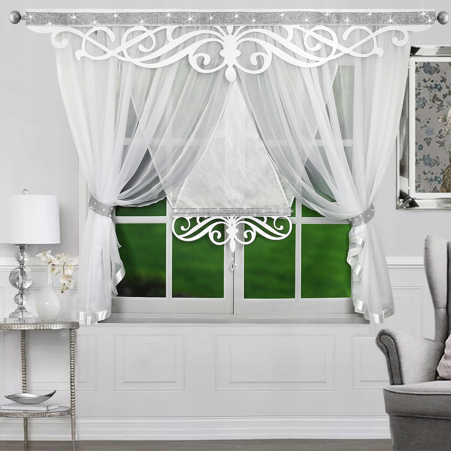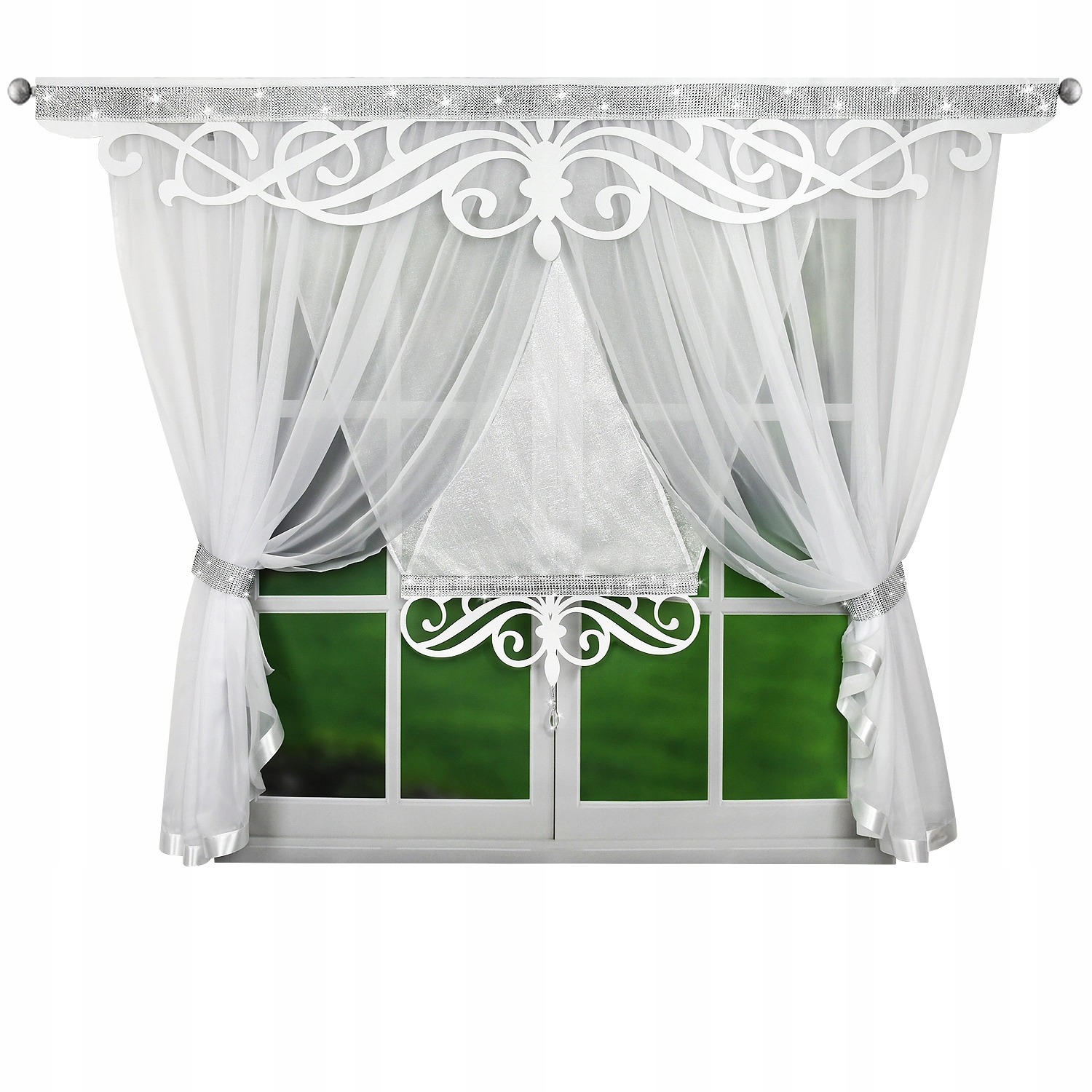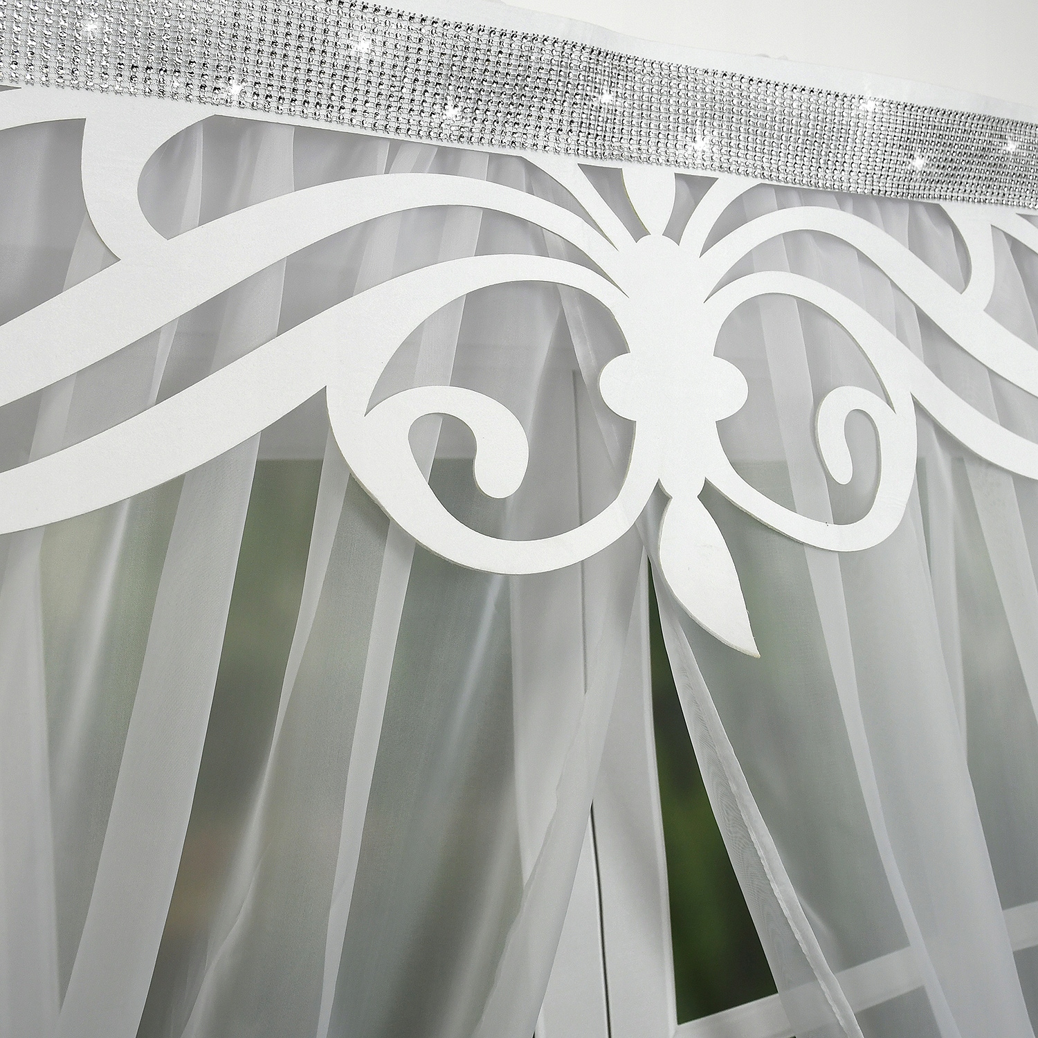Firana woalowa obszyta białą lamówką sprawia, że firana staje się prosta i elegancka a panel z batystu swoim delikatnym połyskiem ażurowym filcem oraz paskiem z cyrkonii i wiszącym kryształem dopełni atrakcyjność naszego wnętrza nadając mu elegancje oraz styl glamour .Zestaw zawiera jeszcze jeden panel ażurowy z cyrkoniami który można doczepić do reszty za pomocą rzepu. Model można dopasować do każdego wystroju wnętrz. Zwiewny i przezroczysty materiał dobrze się układa i sprawia, że promienie słoneczne przedostają się do pomieszczenia.