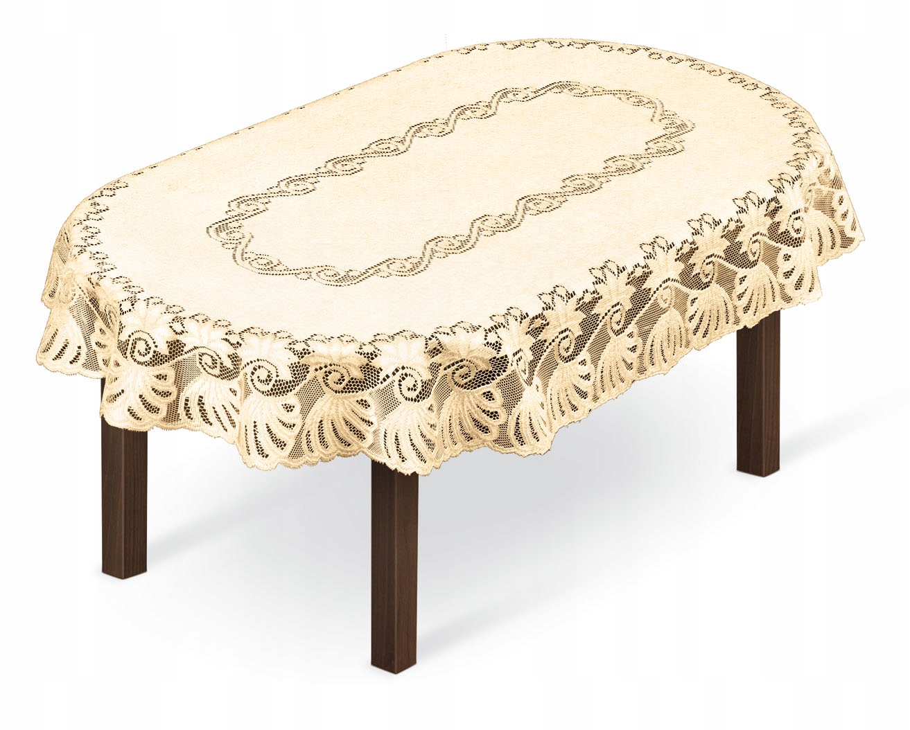 Oferta dotyczy owalnego obrusa żakardowego w kolorze krem- ciemny złoty,bogaty wzór pięknie podkreśla kształt stołu.